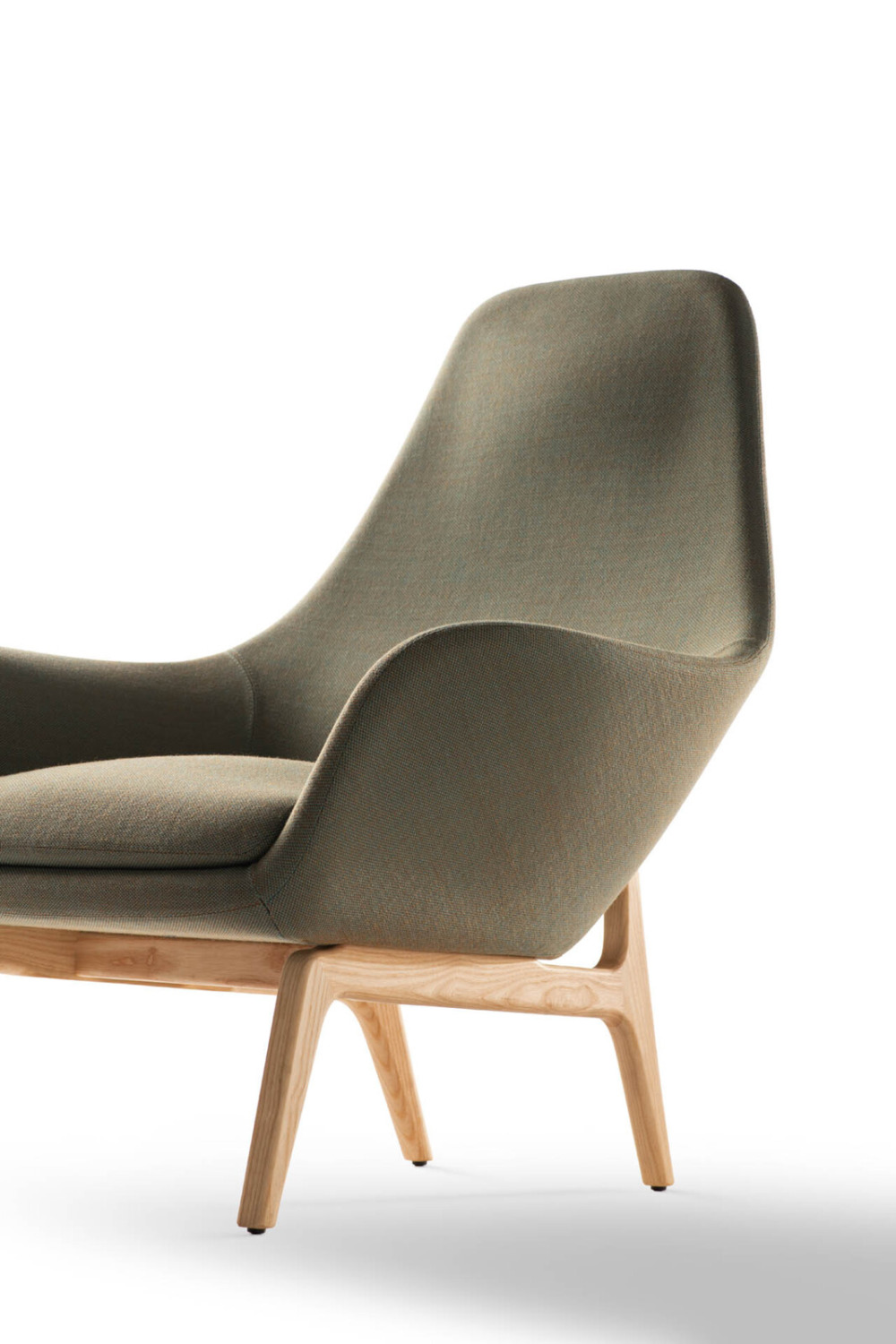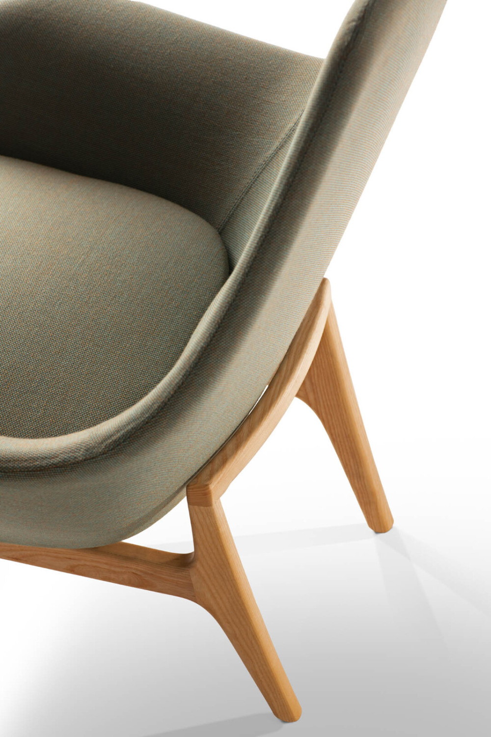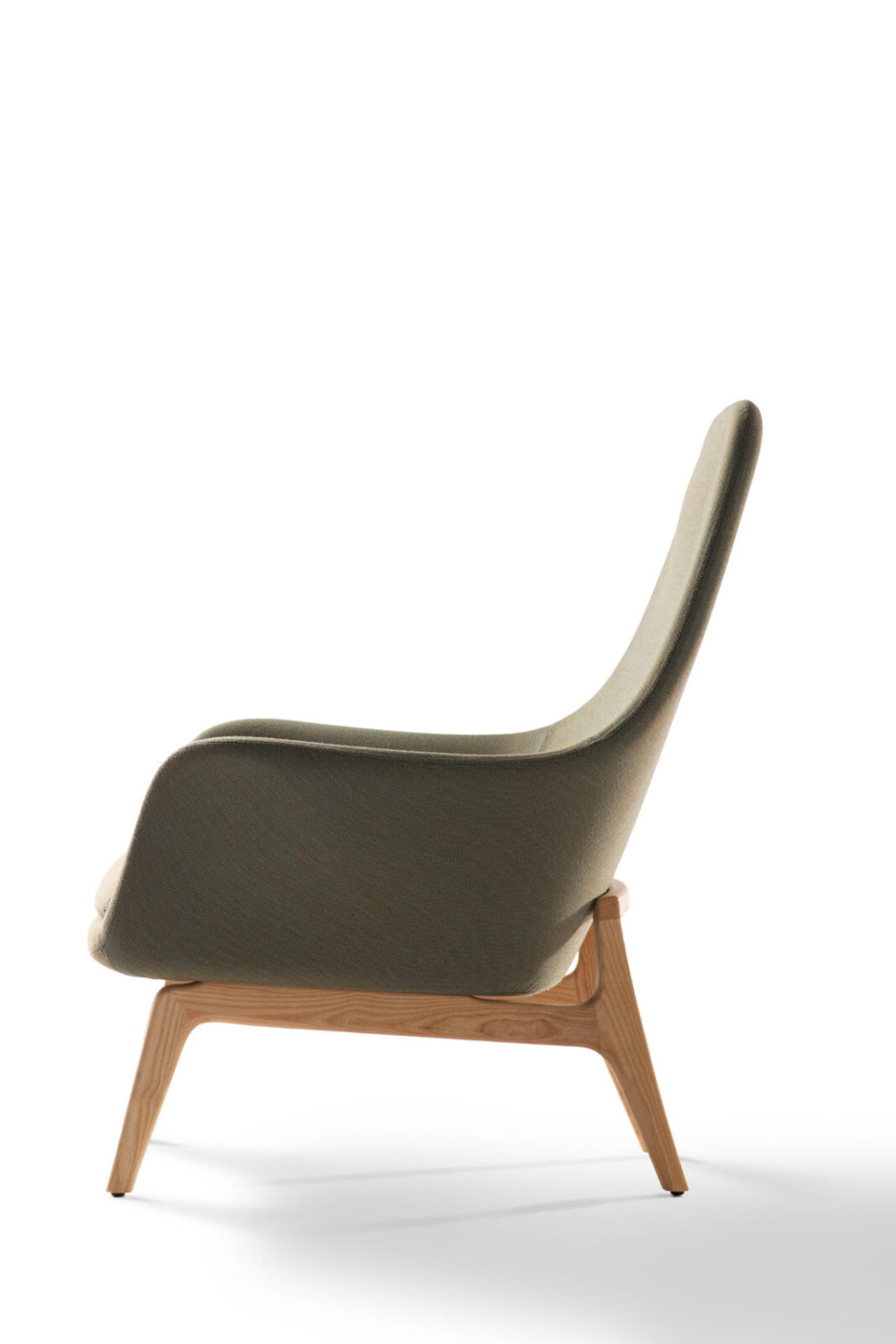 Lounge armchair with high backrest, made of moulded fire-retardant polyurethane, fully upholstered, metal legs.