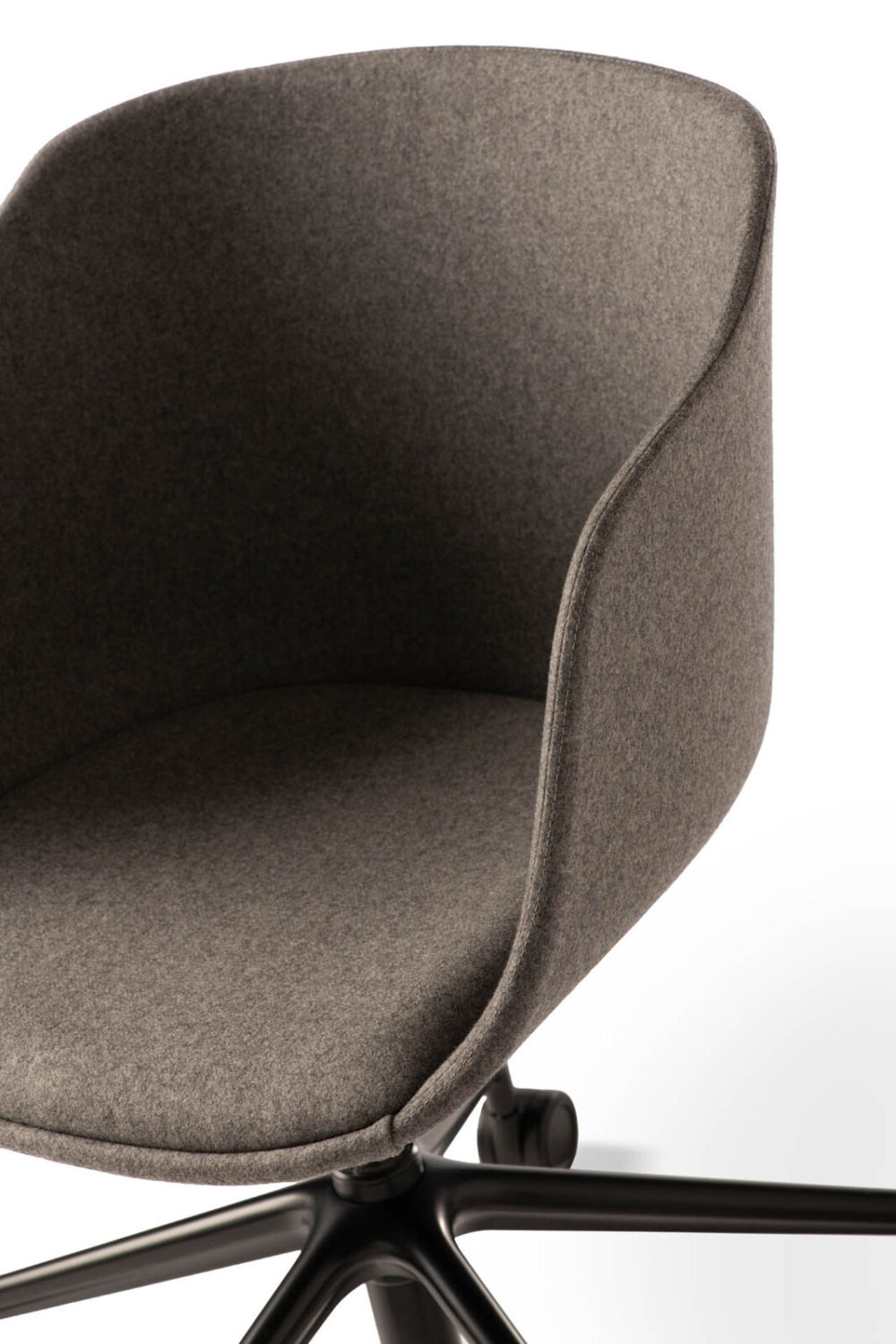 Swivel armchair with polypropylene shell, height-adjustable gas lift, 5-star aluminum base, Ø 60 mm castors. Fully upholstered.