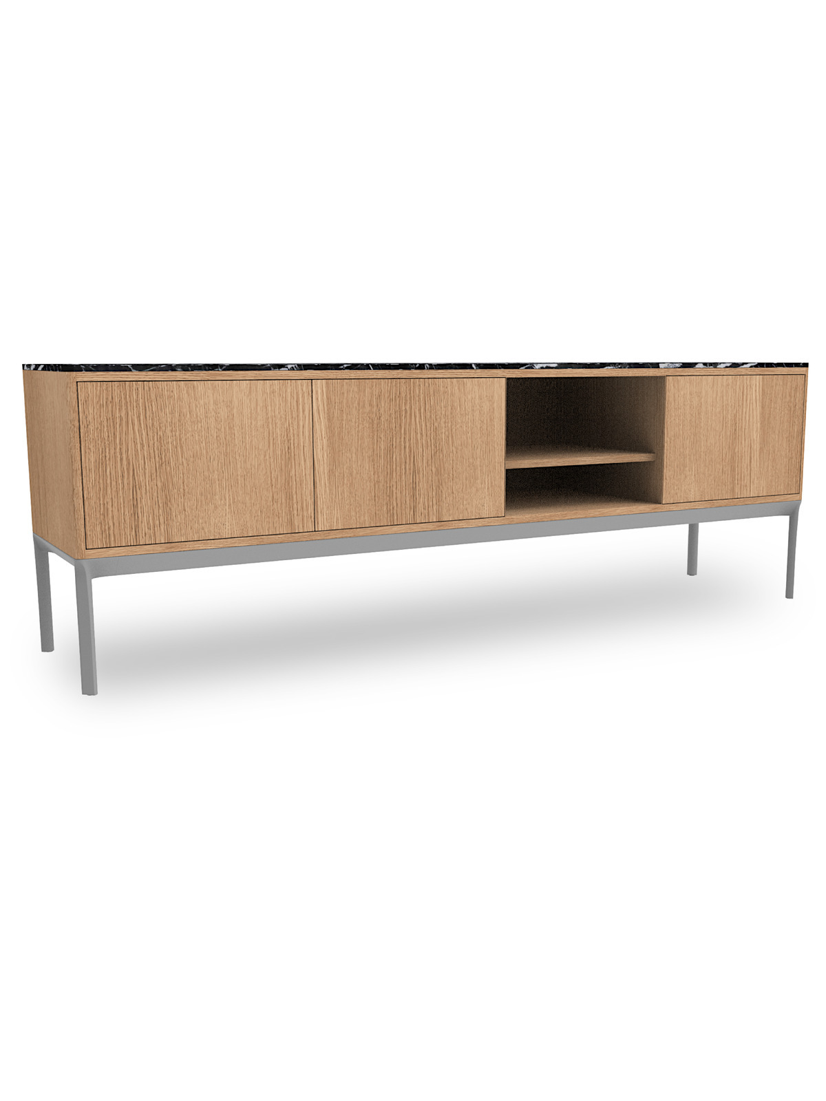 Madia modulare, adattabile in lunghezza e larghezza, corpo centrale in legno, ante con sistema push-pull e vano a giorno; Gamba in alluminio pressofuso. Piano