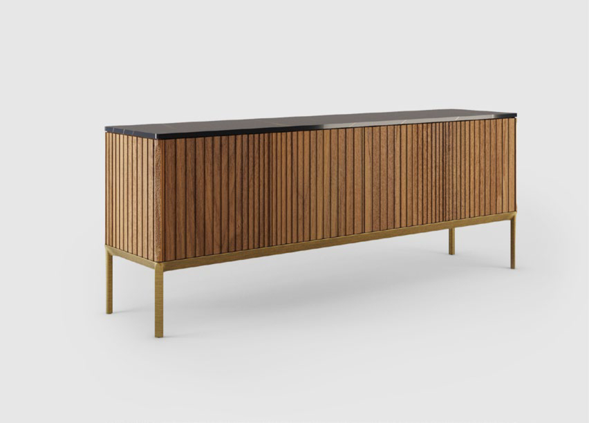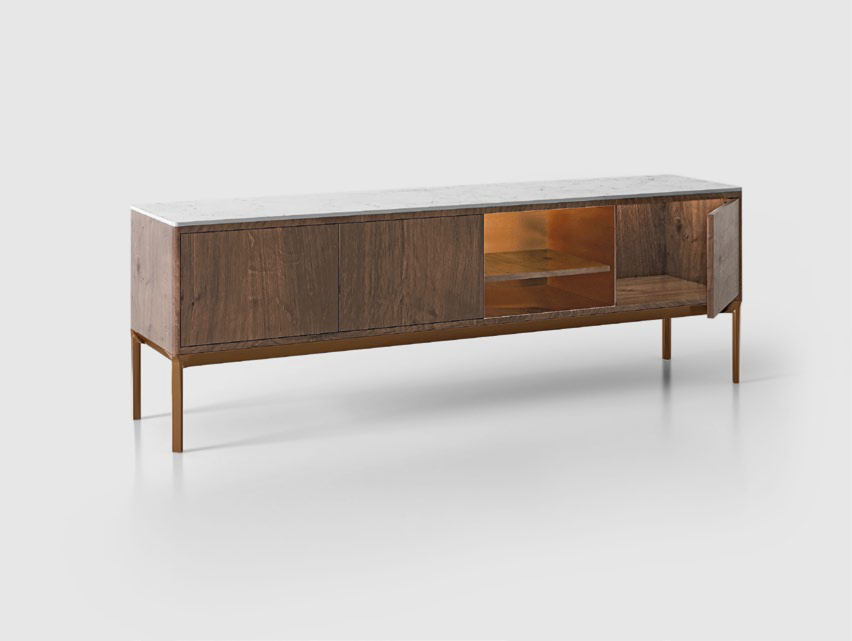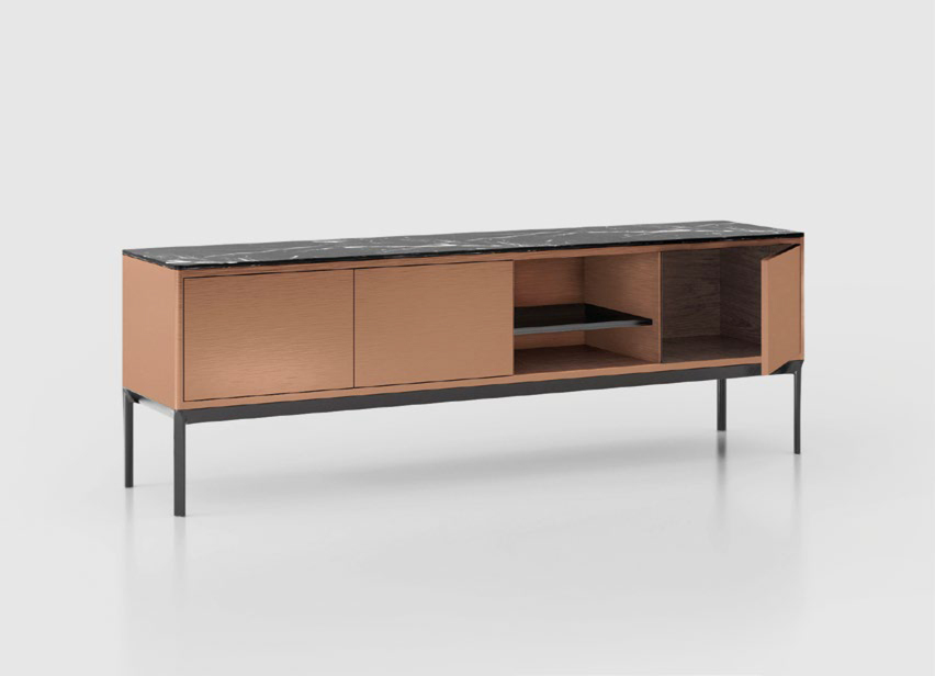 Madia modulare, adattabile in lunghezza e larghezza, corpo centrale in legno, ante con sistema push-pull e vano a giorno; Gamba in alluminio pressofuso. Piano