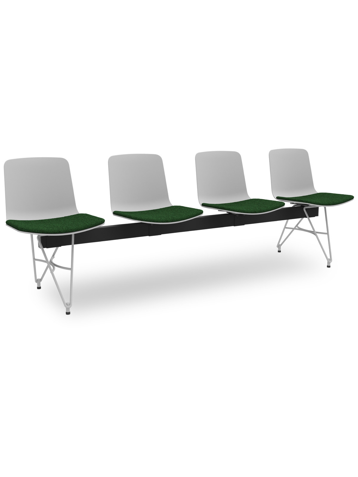 Panca 4 posti con gambe in tondino Ø 12mm, scocca in polipropilene. Versione con sedile tappezzato.