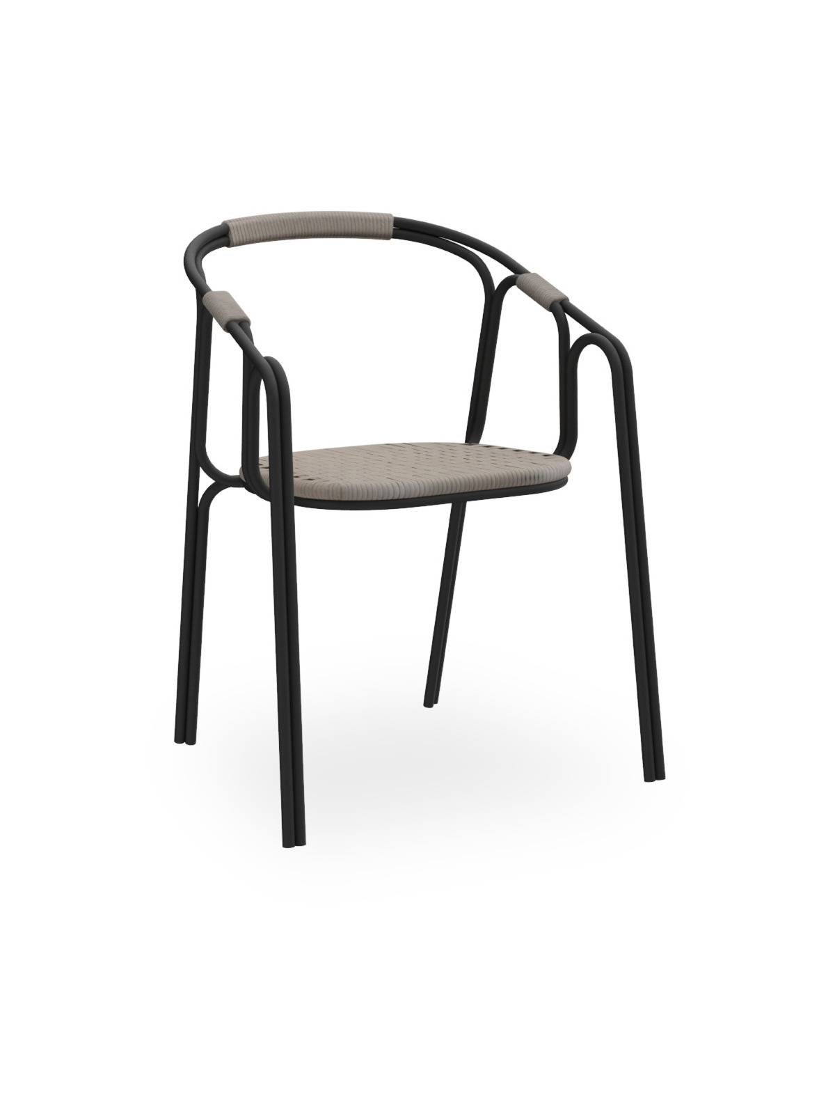 Poltroncina dal design contemporaneo con struttura in metallo tubolare verniciato e seduta realizzata a mano in corda sintetica intrecciata. I braccioli e le porzioni superiori della struttura sono rivestiti in corda coordinata, per un dettaglio estetico che migliora anche il comfort e la presa. La sedia combina leggerezza e robustezza, ed è adatta sia ad ambienti interni che esterni.
