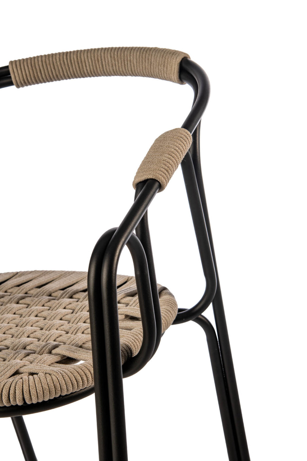 Poltroncina dal design contemporaneo con struttura in metallo tubolare verniciato e seduta realizzata a mano in corda sintetica intrecciata. I braccioli e le porzioni superiori della struttura sono rivestiti in corda coordinata, per un dettaglio estetico che migliora anche il comfort e la presa. La sedia combina leggerezza e robustezza, ed è adatta sia ad ambienti interni che esterni.
