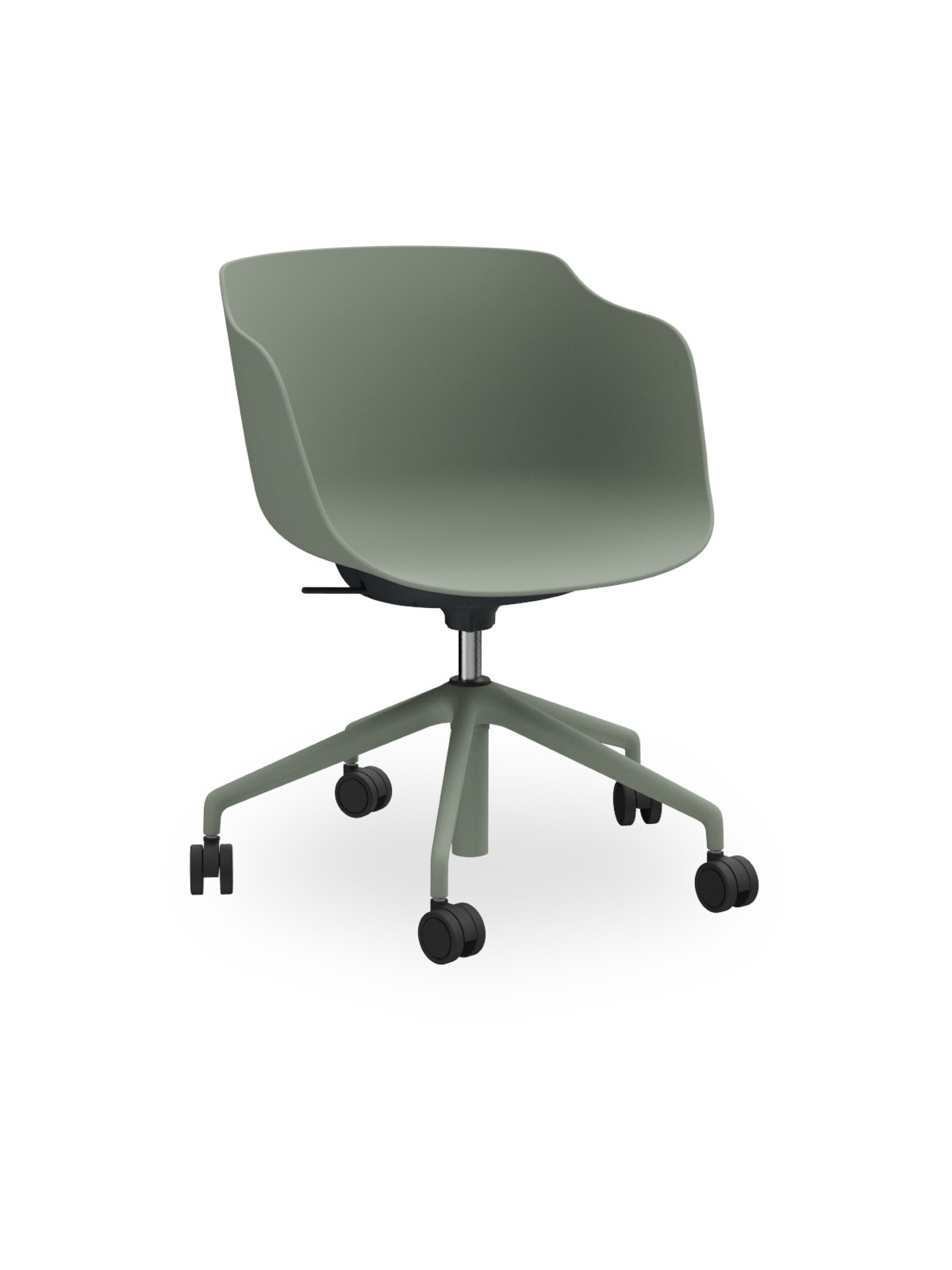 Poltroncina girevole scocca polipropilene, alzata gas, base 5 razze in alluminio, ruote Ø 60.