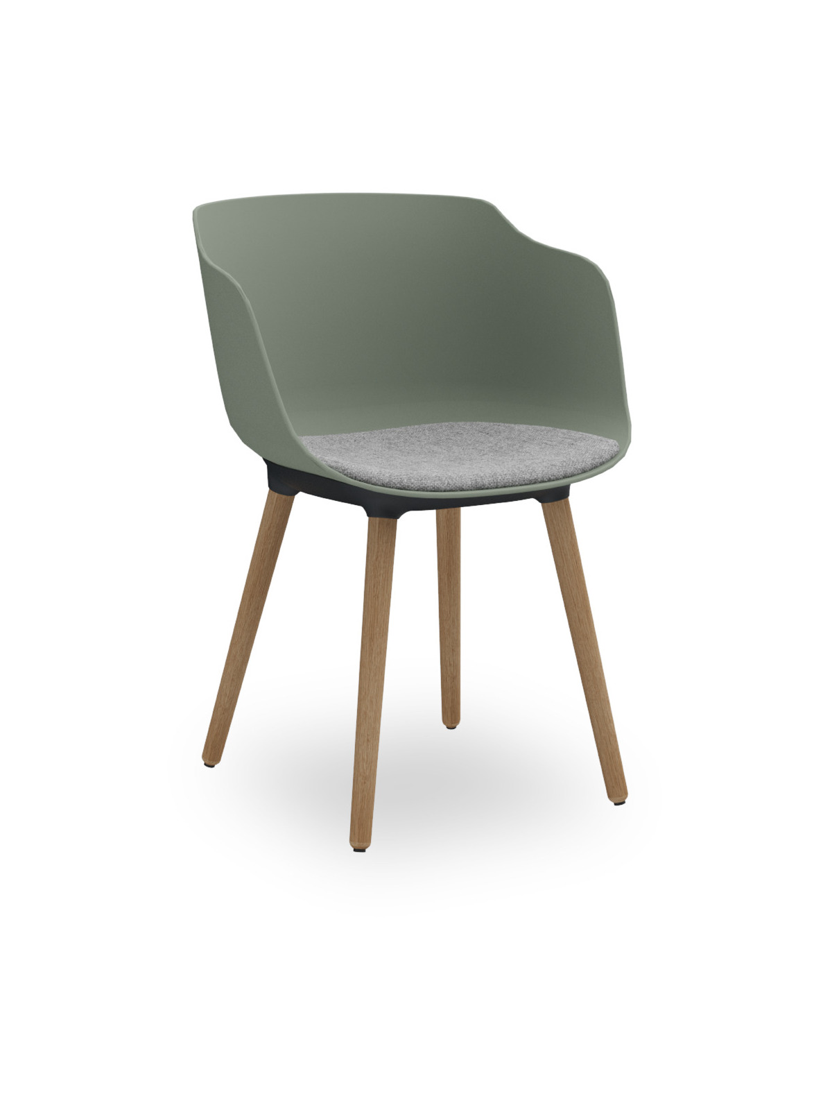 Poltroncina polipropilene, gambe legno. Versione con sedile tappezzato