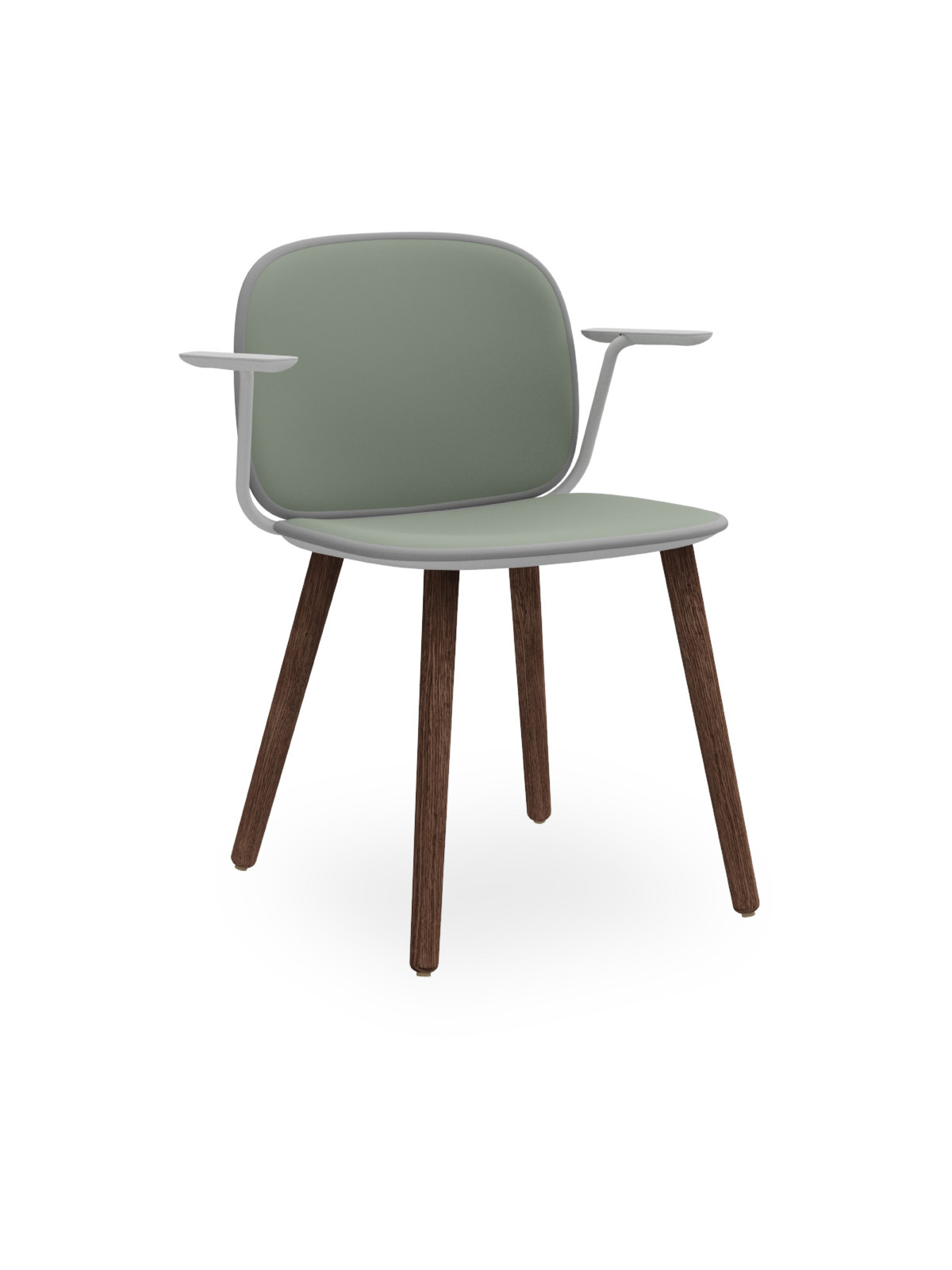 Sedia con scocca in polipropilene con braccioli integrati, rifinita con bordo in gomma che nasconde la giunzione tra rivestimento anteriore e posteriore, assemblata senza viti a vista. Gambe in legno.