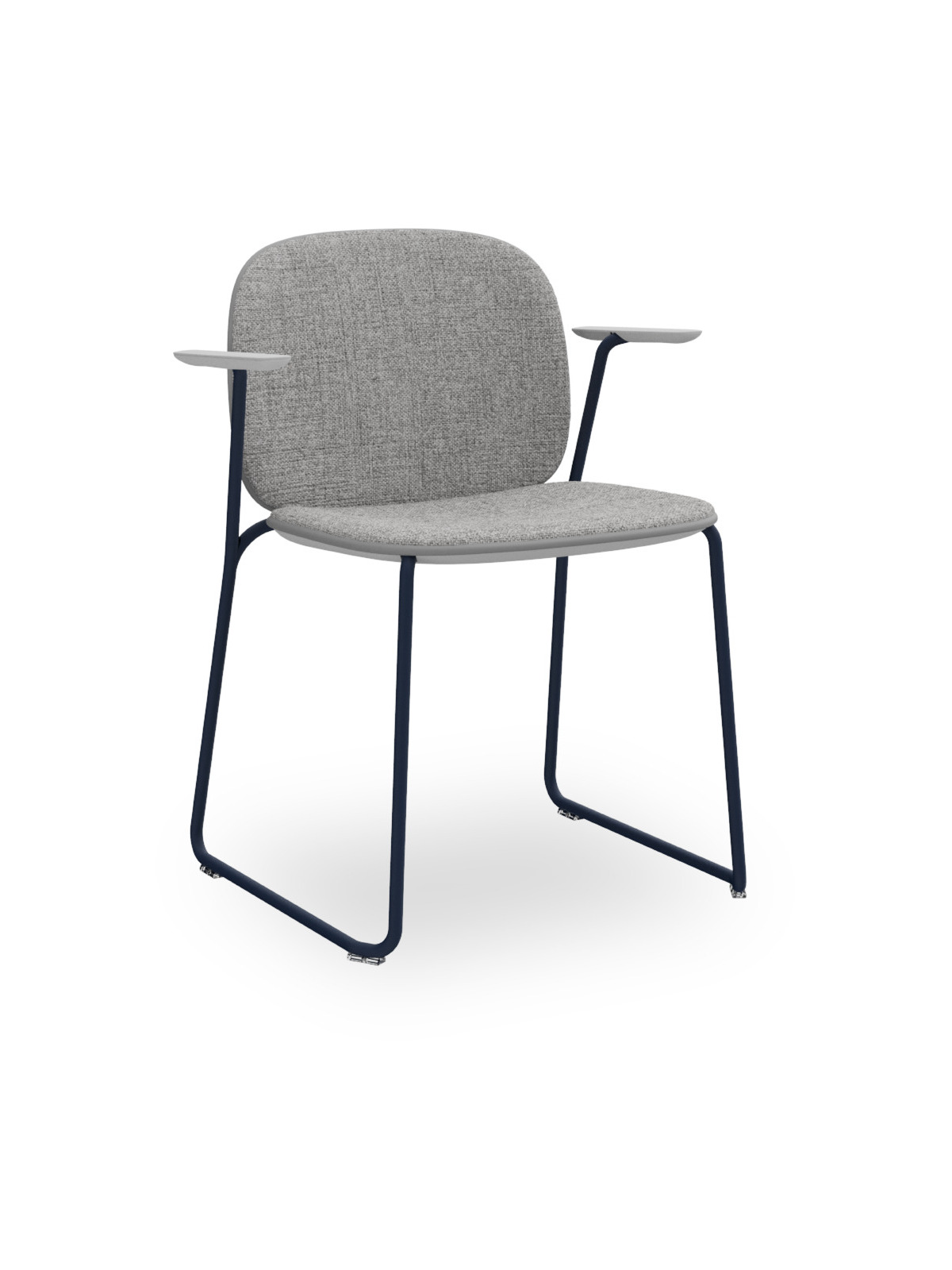Sedia con scocca in polipropilene con braccioli integrati, rifinita con bordo in gomma che nasconde la giunzione tra rivestimento anteriore e posteriore, assemblata senza viti a vista. Gambe slitta Ø16 mm. Versione tutta tappezzata.