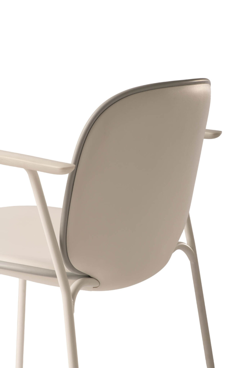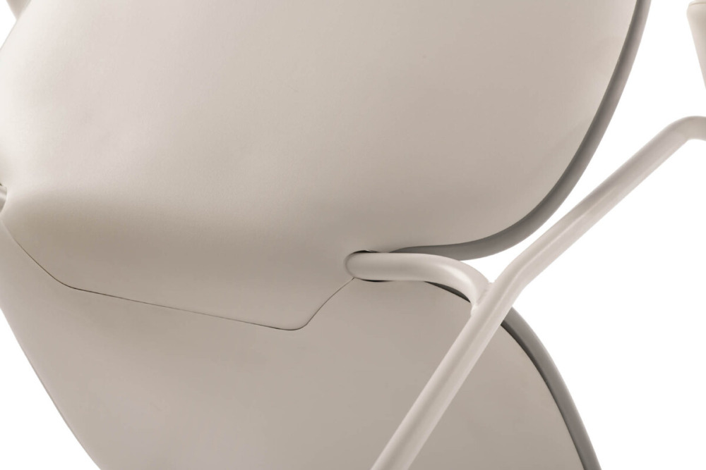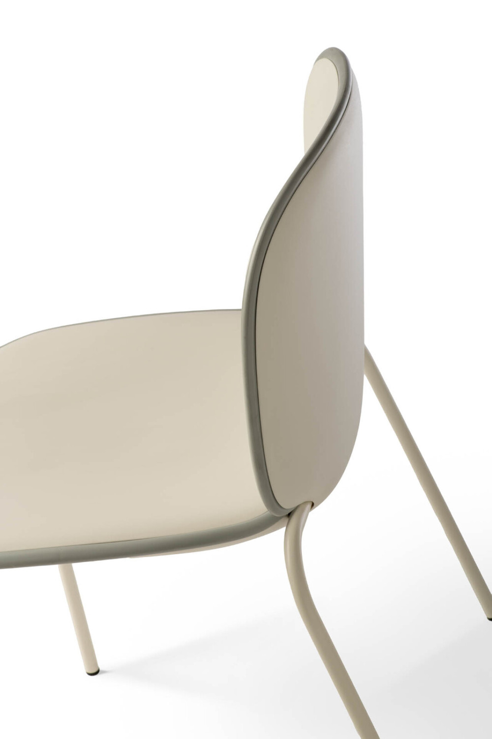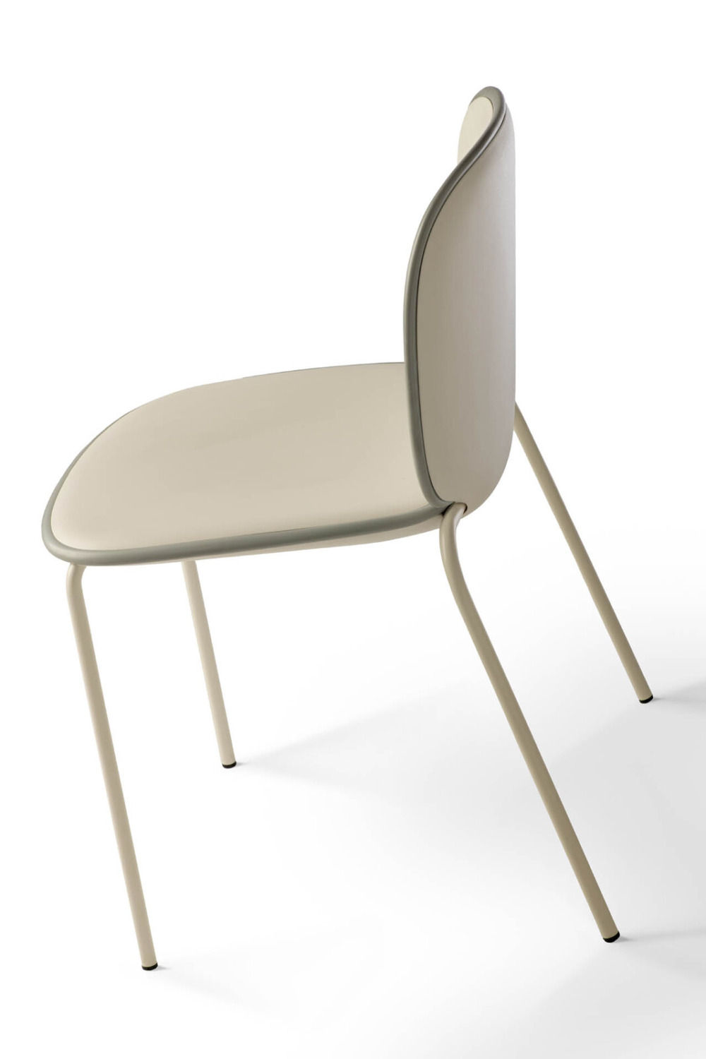 Sedia con scocca in polipropilene, rifinita con bordo in gomma che nasconde la giunzione tra rivestimento anteriore e posteriore, assemblata senza viti a vista. Gambe in tubolare metallico Ø16 mm.