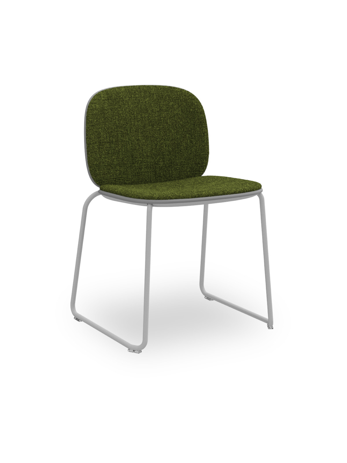 Sedia con scocca in polipropilene, rifinita con bordo in gomma che nasconde la giunzione tra rivestimento anteriore e posteriore, assemblata senza viti a vista. Gambe slitta Ø16 mm. Versione tutta tappezzata.