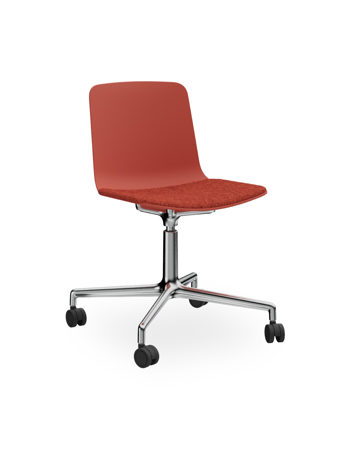 Sedia girevole scocca polipropilene, altezza fissa, base 4 razze in alluminio e ruote. Versione con sedile tappezzato.