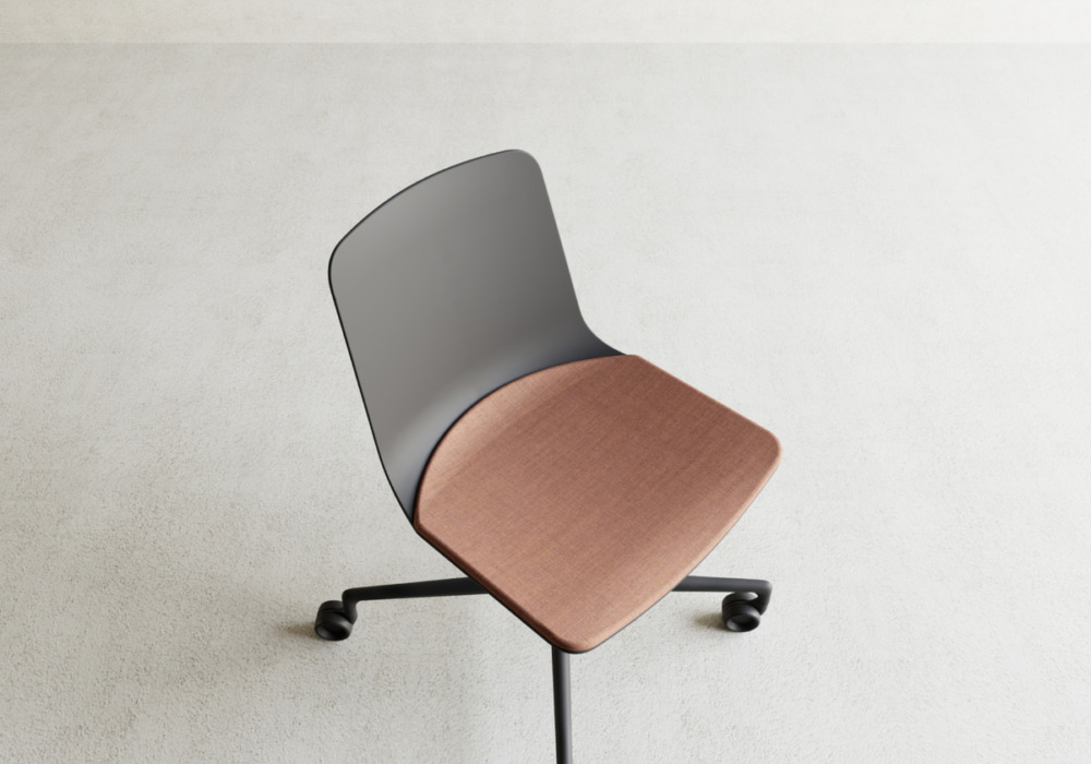 Sedia girevole scocca polipropilene, altezza fissa, base 4 razze in alluminio e ruote. Versione con sedile tappezzato.