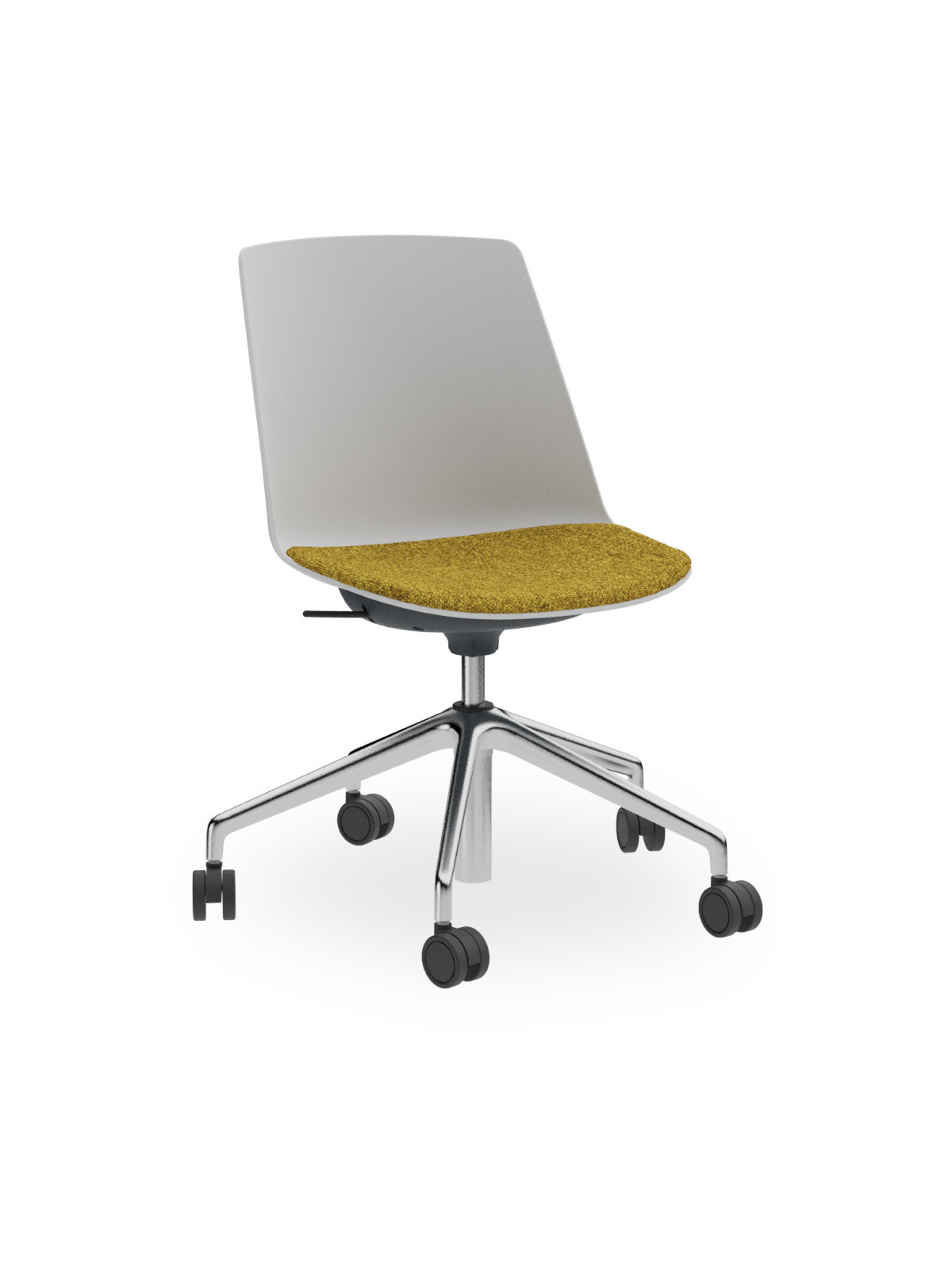 Sedia girevole scocca polipropilene, alzata gas, base 5 razze in alluminio, ruote Ø 60. Versione con sedile tappezzato.