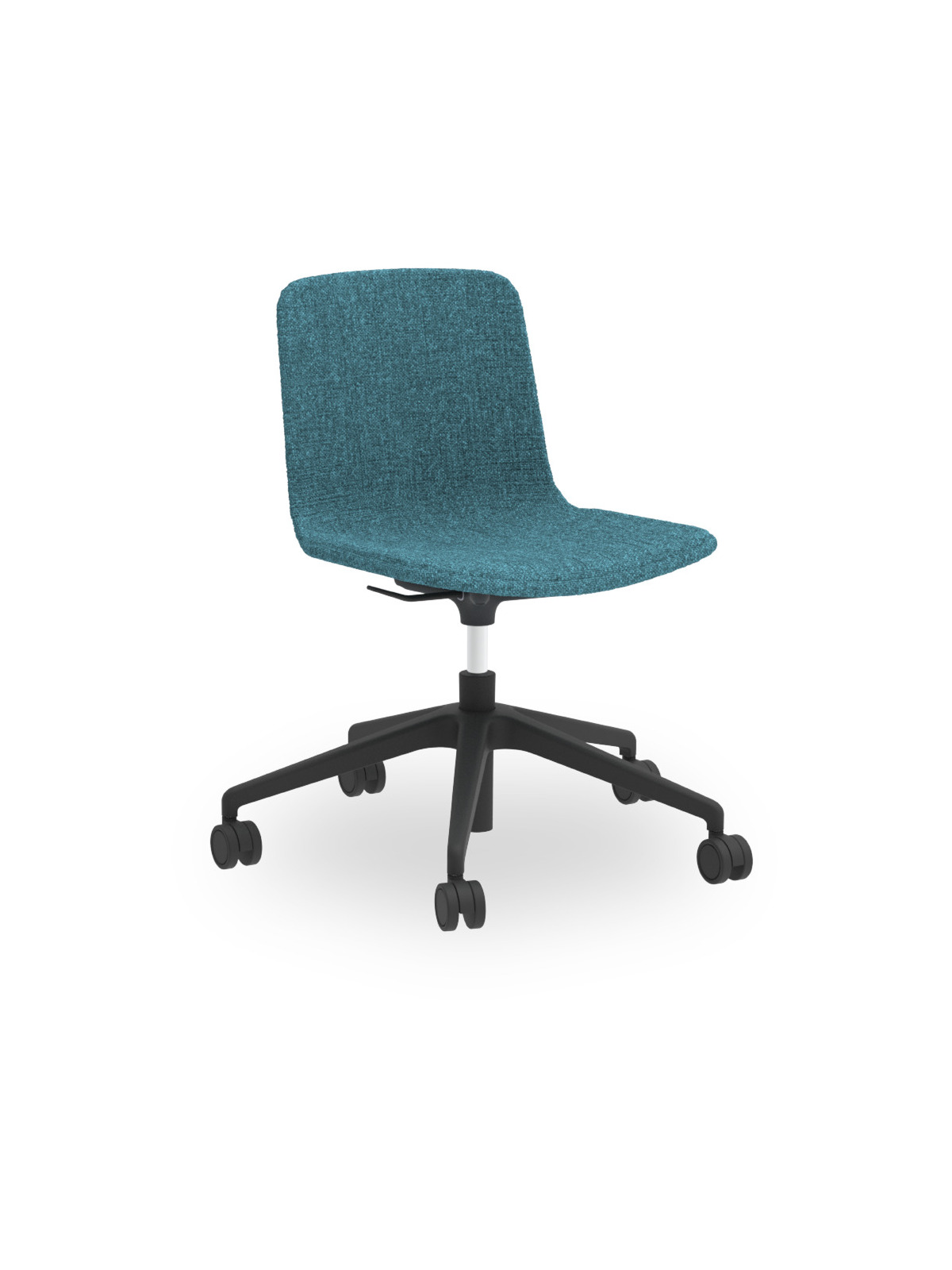 Sedia girevole scocca polipropilene, alzata gas, base 5 razze in nylon, ruote Ø 60. Versione tutta tappezzata.