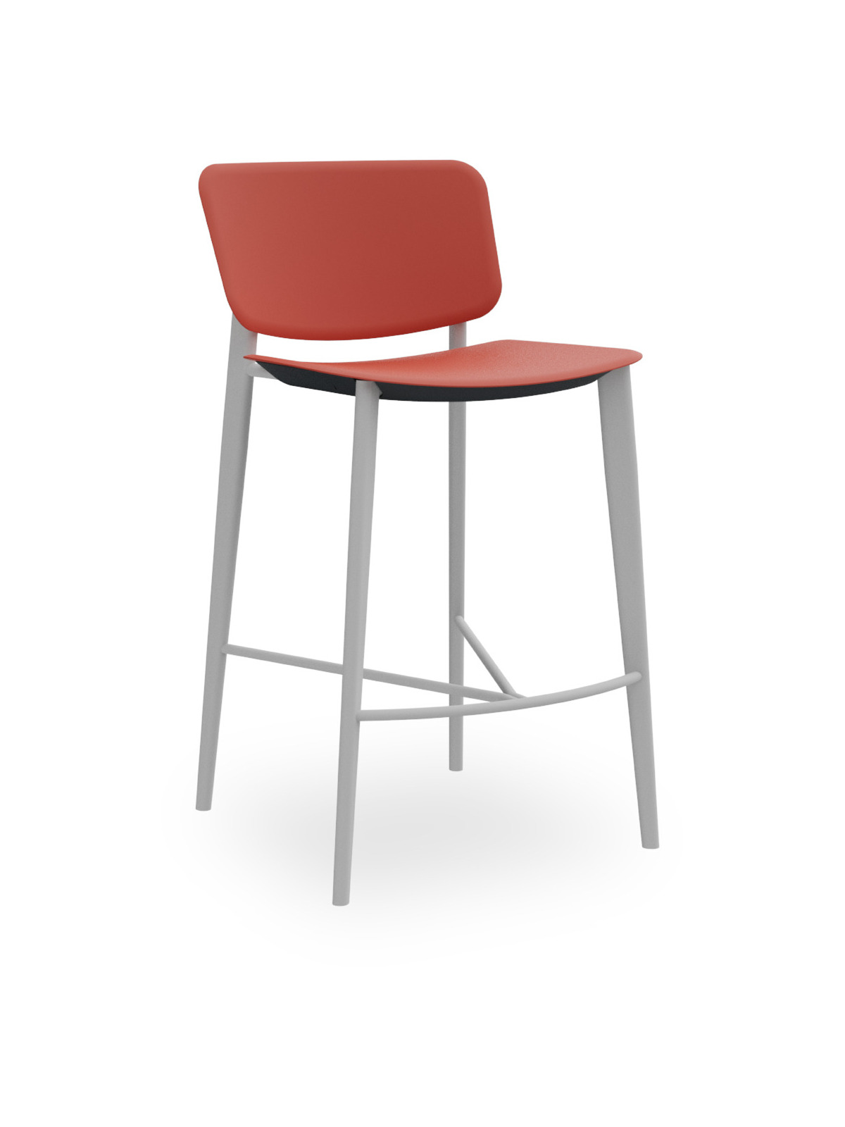 Sgabello con seduta e schienale in polipropilene, struttura metallica con gambe conificate e poggiapiedi.