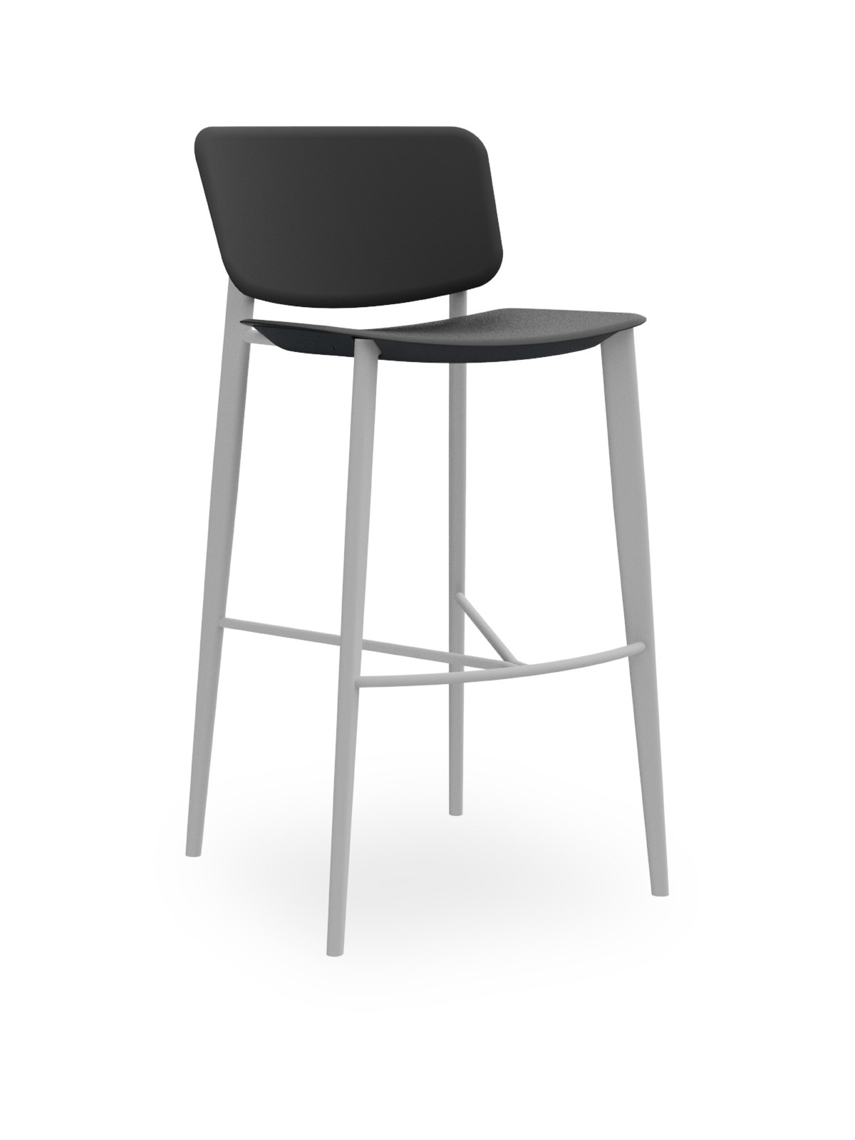 Sgabello con seduta e schienale in polipropilene, struttura metallica con gambe conificate e poggiapiedi.