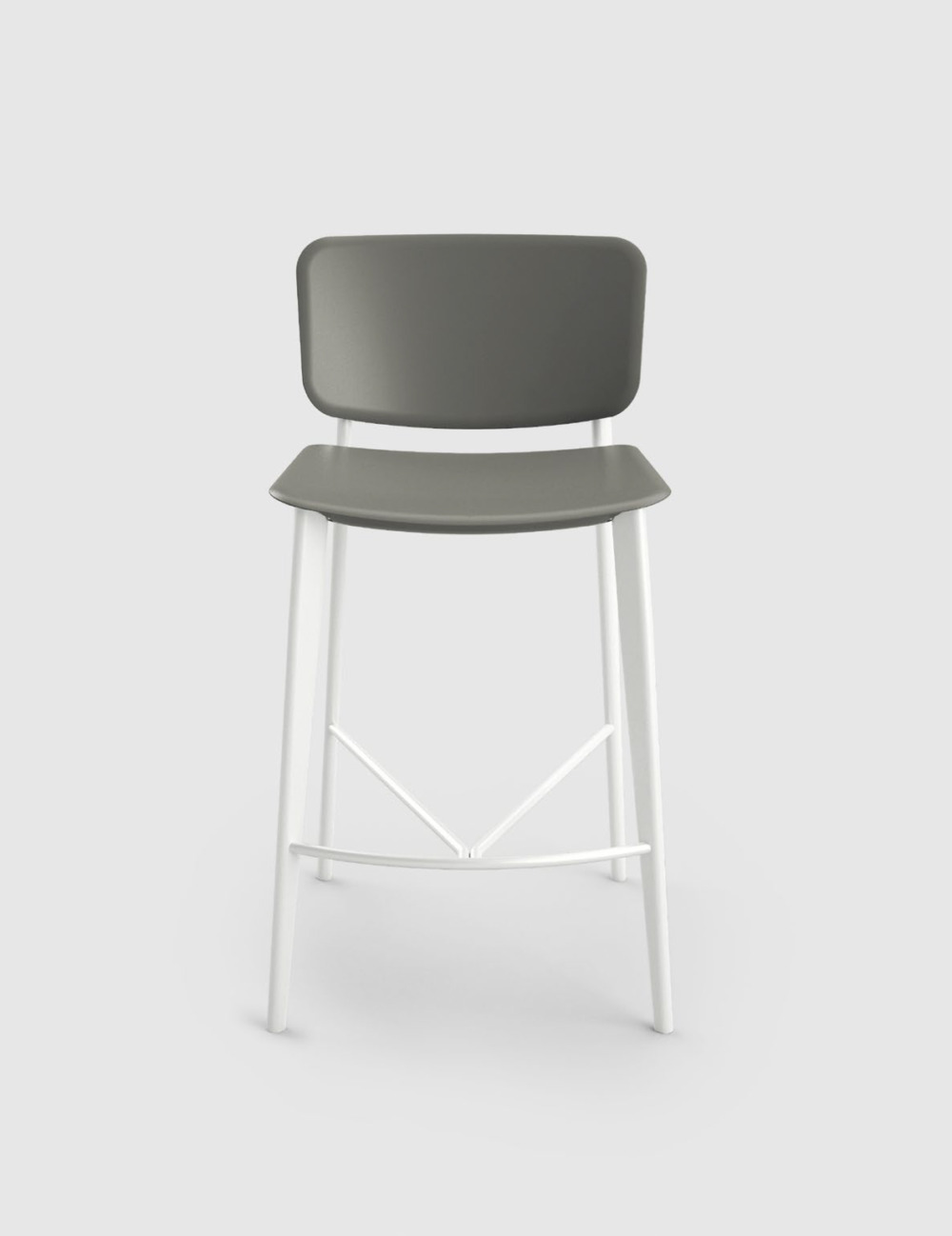 Sgabello con seduta e schienale in polipropilene, struttura metallica con gambe conificate e poggiapiedi.
