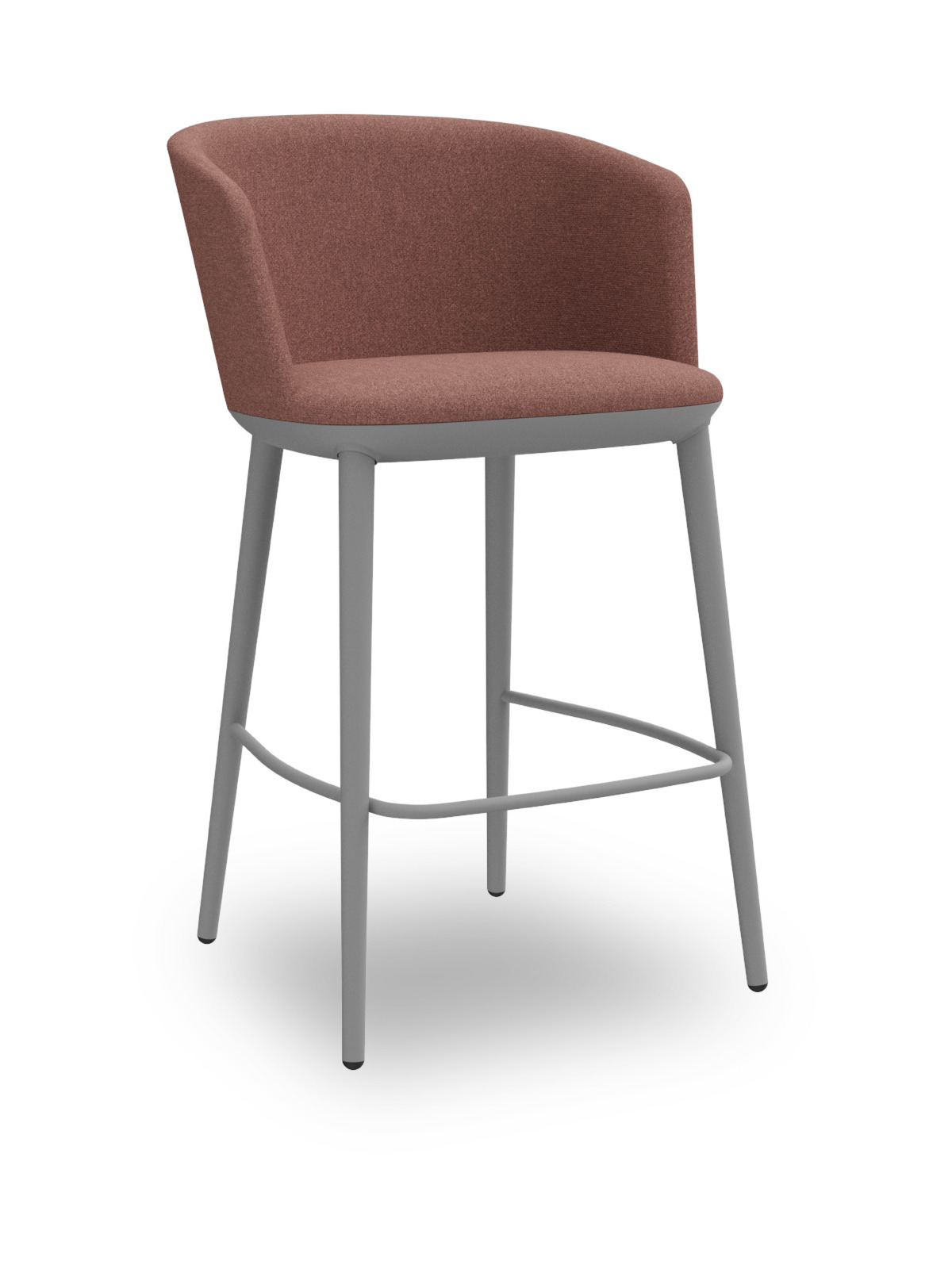 Sgabello in poliuretano ignifugo stampato, completamente rivestito, con inserto interno in materiale plastico che consente una leggera flessione dello schienale per migliorare il comfort e l’ergonomia. Base in metallo conificato comprensivo di anello poggiapiedi.