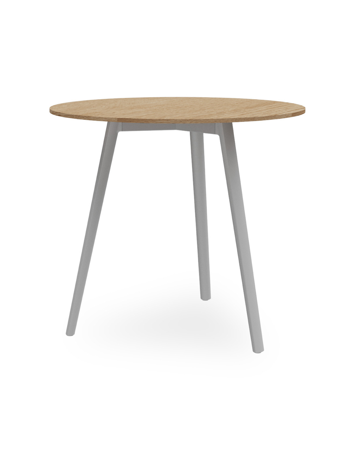 Tavolo modulare, struttura metallica a 3 gambe, top disponibile in diverse finiture. Telaio verniciato e top Ø80.