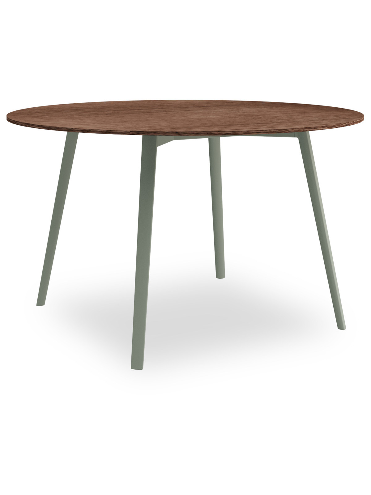Tavolo modulare, struttura metallica a 4 gambe, top disponibile in diverse finiture. Telaio verniciato e top Ø120.