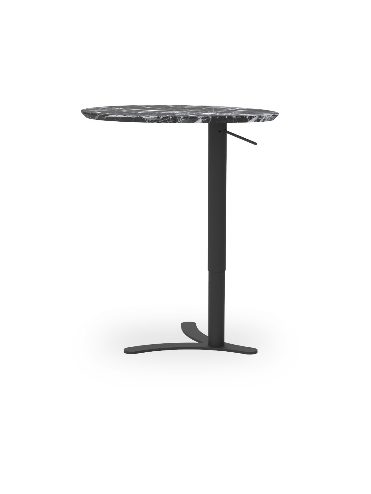 Tavolo side, regolabile in altezza. Struttura e base in metallo. Top disponibile in diverse finiture.